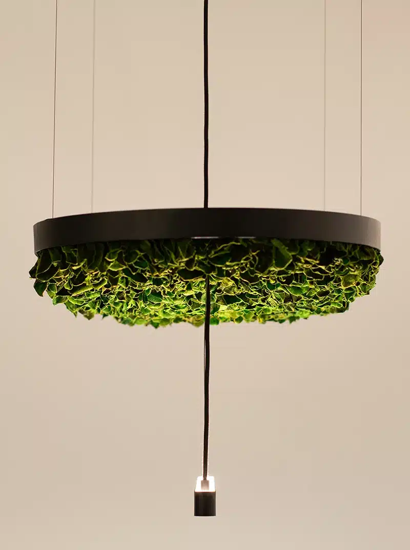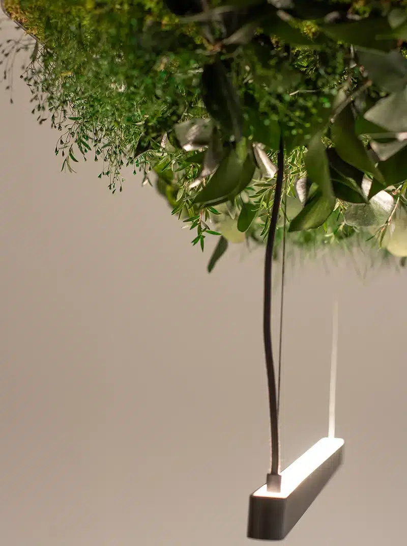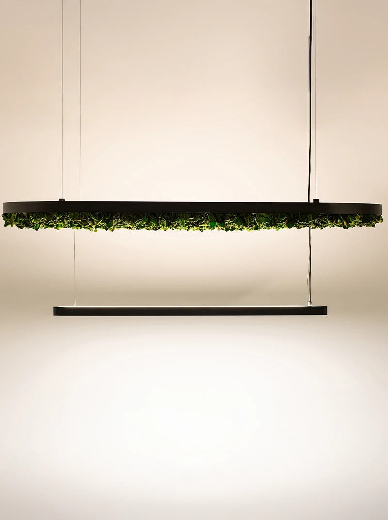 Hoverlight는 물, 빛, 유지 관리가 필요 없는 무화학 공정을 통해 안정화된 보존 식물을 사용하여 제작됩니다. 모든 구성 요소는 높은 내구성과 낮은 환경 영향을 기준으로 엄선됩니다.
