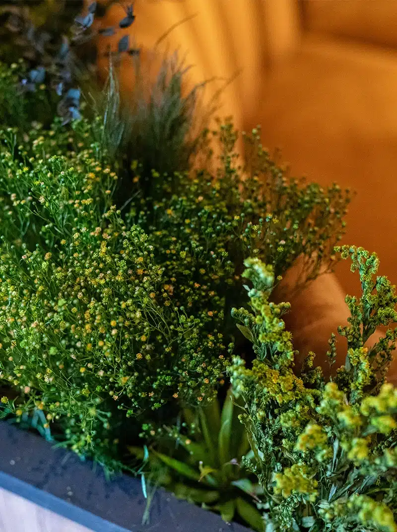 Greenmood의 맞춤형 플랜터 필링은 물 주기, 가지치기, 햇빛이 필요 없는 보존 식물로 구성되어 실내 공간에 오래 지속되는 자연의 생기를 더합니다.